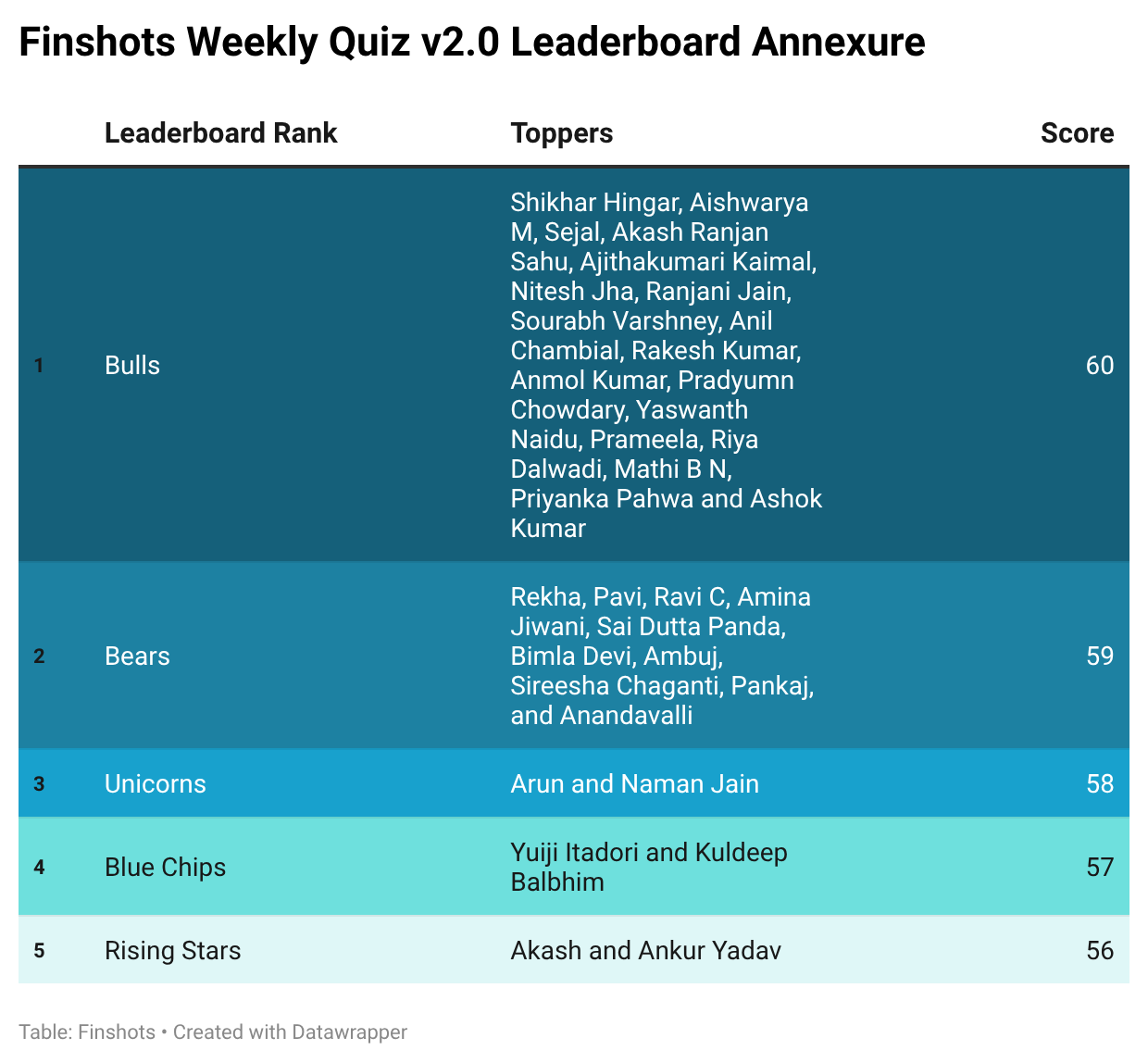 Next, let’s move on to the top scorers from our previous weekly quiz. There were a whole bunch of you who participated, and many of you ended up with the same scores. So we’re calling you Bulls, Bears, Unicorns, Blue Chips, and Rising Stars. Here’s how the leaderboard looks right now:
