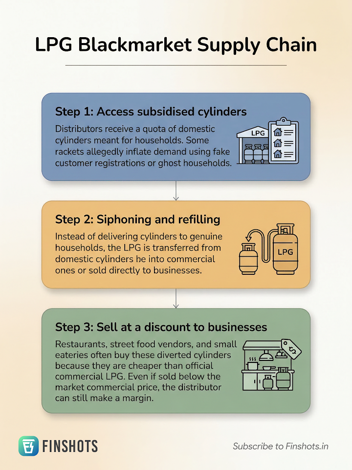 First, access to subsidised cylinders is secured. Distributors receive quotas intended for household delivery, but rackets may inflate demand by using ghost households or fake registrations to increase their allocations.