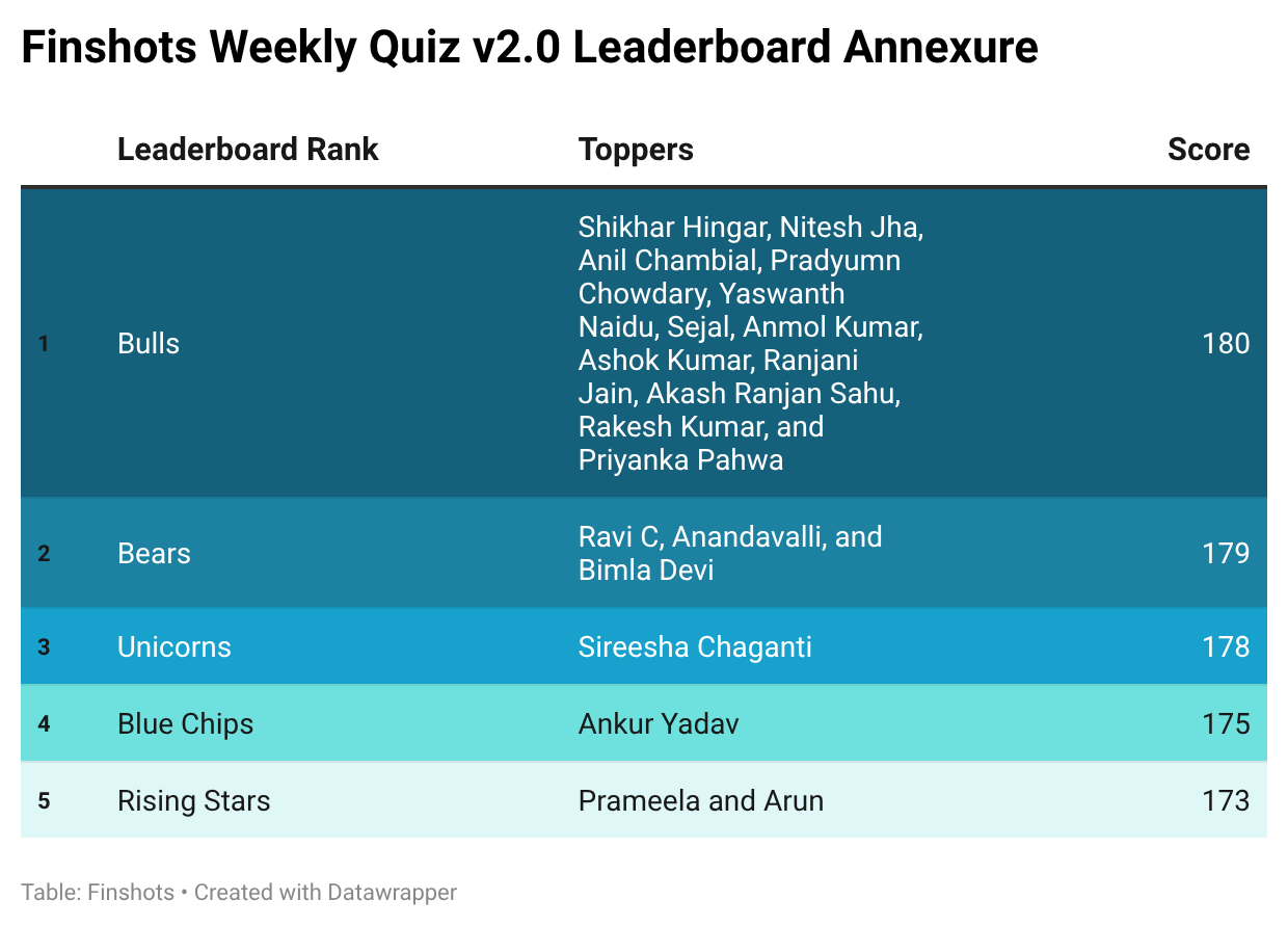 But for now, it’s time to announce the top scorers of our previous weekly quiz. There were a whole bunch of you who participated, and many of you ended up with the same scores. So we’re calling you Bulls, Bears, Unicorns, Blue Chips, and Rising Stars. Here’s how the leaderboard looks right now: