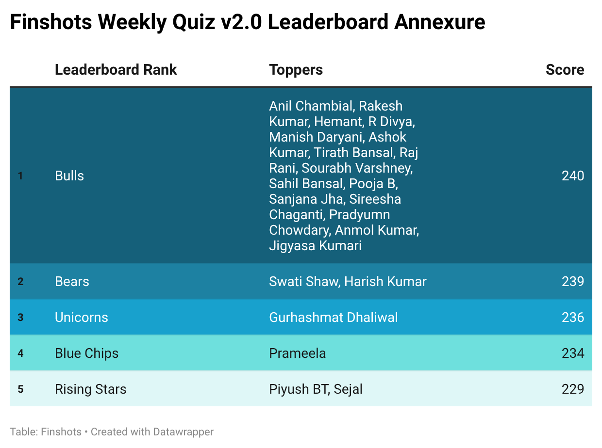 And to the rest of you whose names made it to the leaderboard, congratulations! You may not have won the merch this time, but you showed up consistently and earned a spot on Finshots’ weekly leaderboard. That’s pretty cool.