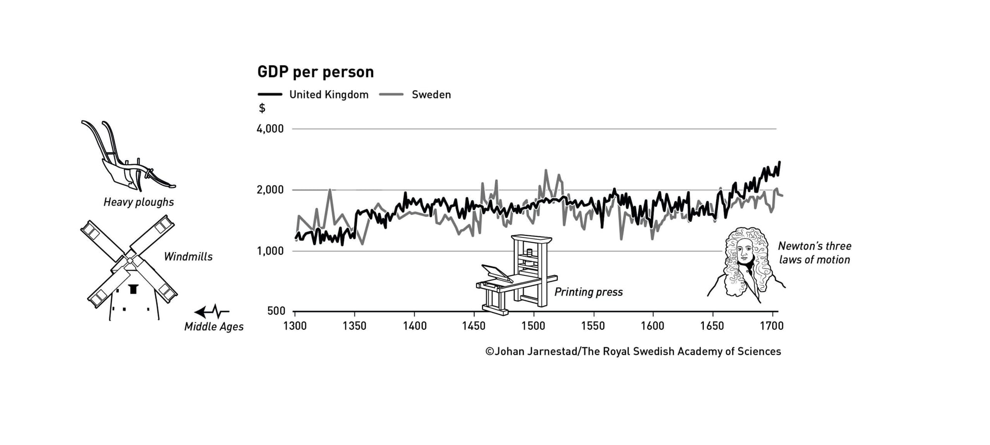 When he looked at data from Sweden and Britain between the early 1300s and the early 1700s, he noticed that incomes sometimes went up and sometimes dipped. But overall, there was barely any long-term growth — even with big, disruptive innovations like the invention of the printing press.