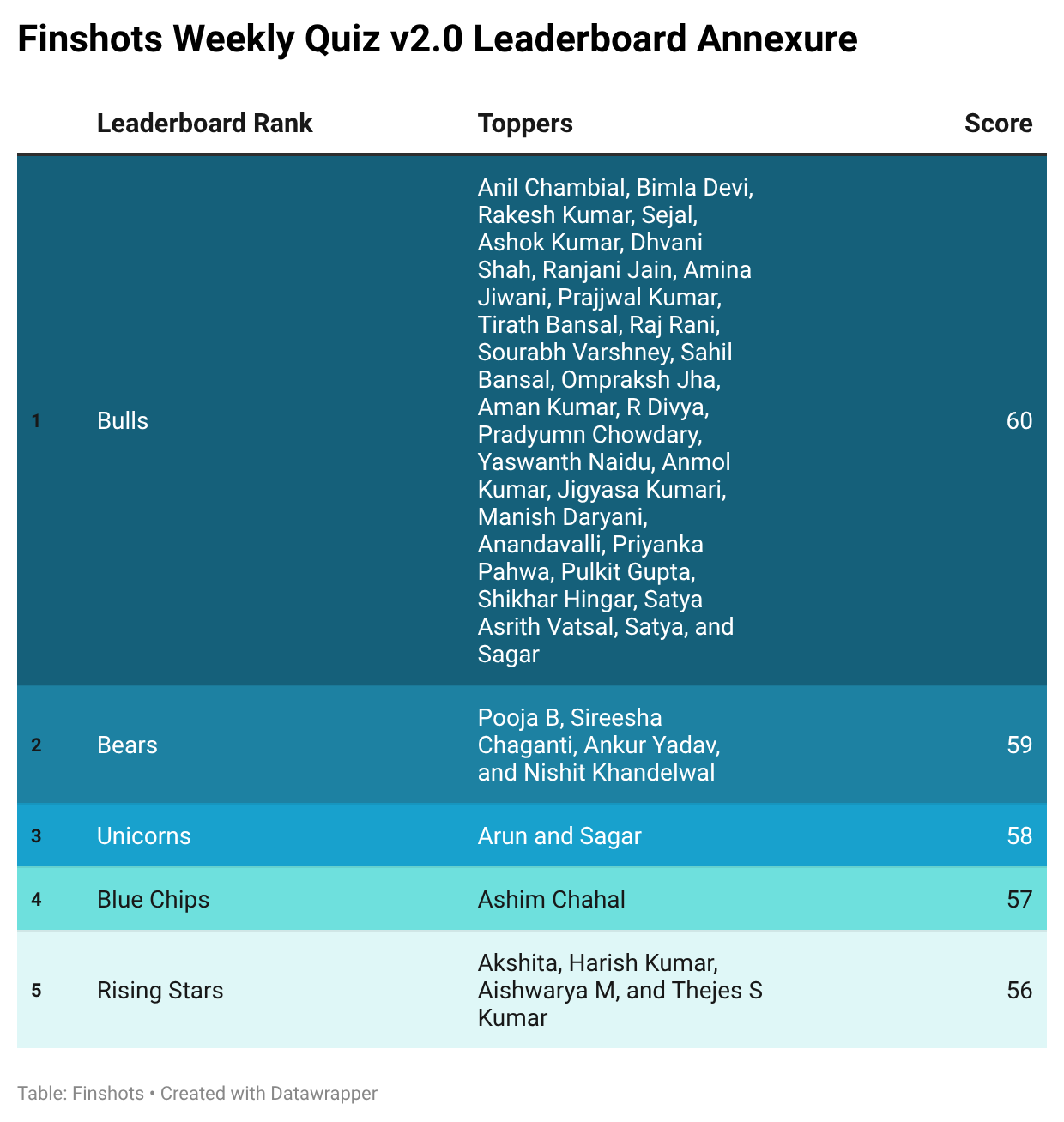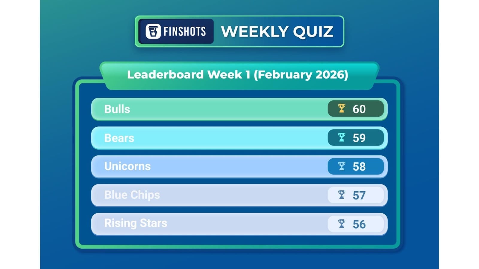 Next, let’s move on to the top scorers from our previous weekly quiz. There were a whole bunch of you who participated, and many of you ended up with the same scores. So we’re calling you Bulls, Bears, Unicorns, Blue Chips, and Rising Stars. Here’s how the leaderboard looks right now: