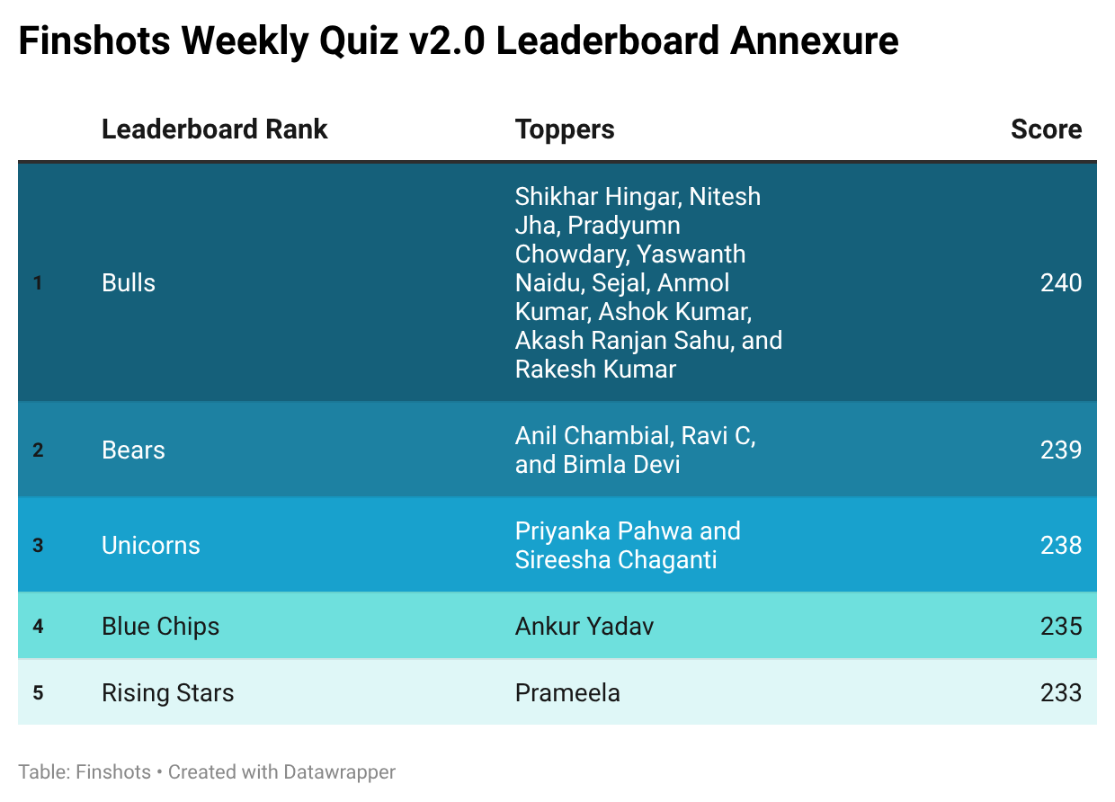 And to the rest of you whose names made it to the leaderboard, congratulations! You may not have won the merch this time, but you showed up consistently and earned a spot on Finshots’ weekly leaderboard. That’s pretty cool.