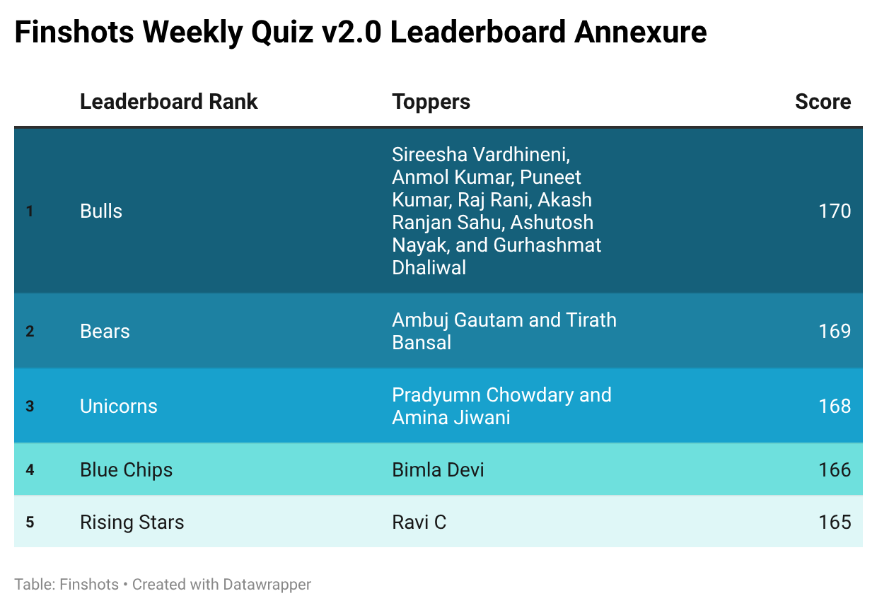 And to the rest of you whose names made it to the leaderboard, congratulations! You may not have won the merch this time, but you showed up consistently and earned a spot on Finshots’ weekly leaderboard. That’s pretty cool.