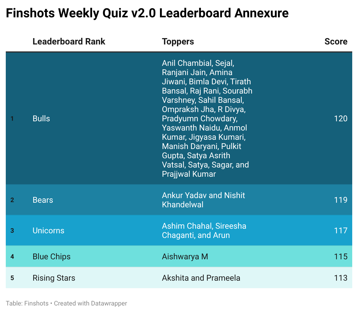 Next, let’s move on to the top scorers from our previous weekly quiz. There were a whole bunch of you who participated, and many of you ended up with the same scores. So we’re calling you Bulls, Bears, Unicorns, Blue Chips, and Rising Stars. Here’s how the leaderboard looks right now: