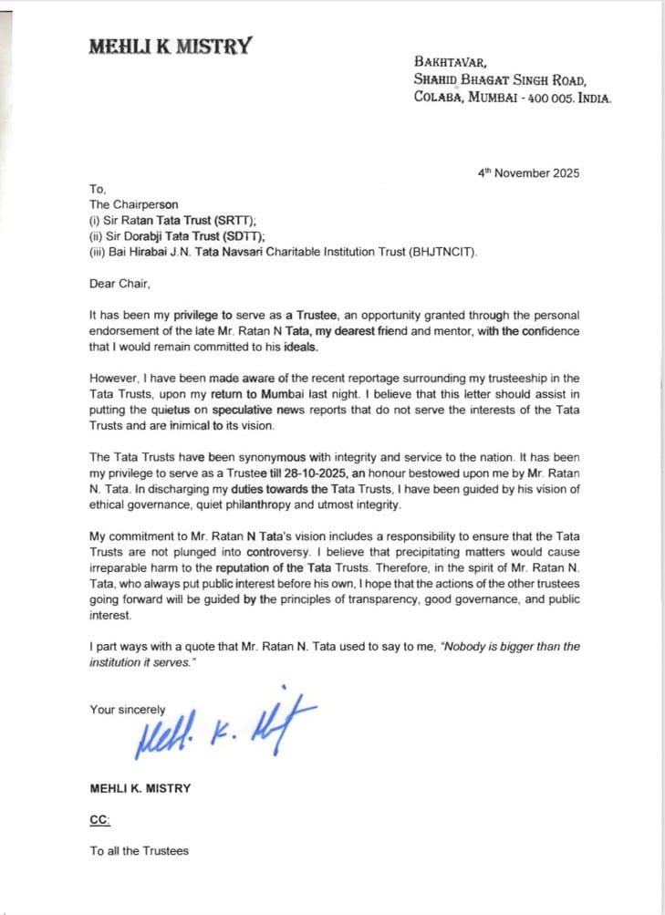 When the delegation returned to Mumbai, the mood had shifted. Within weeks, Mehli Mistry withdrew his legal caveat. On November 4, he formally resigned from Tata Trusts, writing that he “did not wish to be a source of discord.” His letter closed with a line Ratan Tata often repeated: “Nobody is bigger than the institution it serves.”
