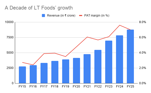 It buys paddy, ages it for over a year, and then sells premium basmati rice under brands like Daawat in India and Royal in the US and Canada. And that model has worked exceptionally well. The company today commands roughly 55% market share in the US basmati segment. Its Royal brand alone has grown from $35 million in revenue in 2007 into a $400 million business today.