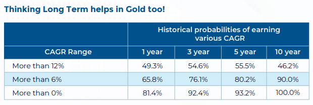 Historical data from June 1999 to August 2025 shows that 10-year rolling SIPs in gold yielded an XIRR of over 6% in 90% of instances. Most notably, none of the 10-year SIPs over that 26-year period yielded negative returns.