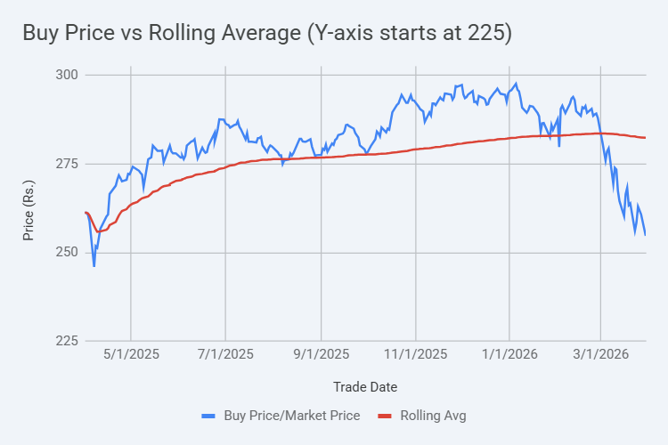 Over the past year (from 1 April 2025 to 1 April 2026), I have been buying one Nifty ETF (NiftyBees) every single day, without trying to time the market. As a result, I have deployed roughly ₹70,000 across 249 trading sessions. And my average purchase price was around ₹282 per unit, while the price on 1st April 2026 sat closer to ₹255. On paper, this translates to a loss of nearly ₹6,900.